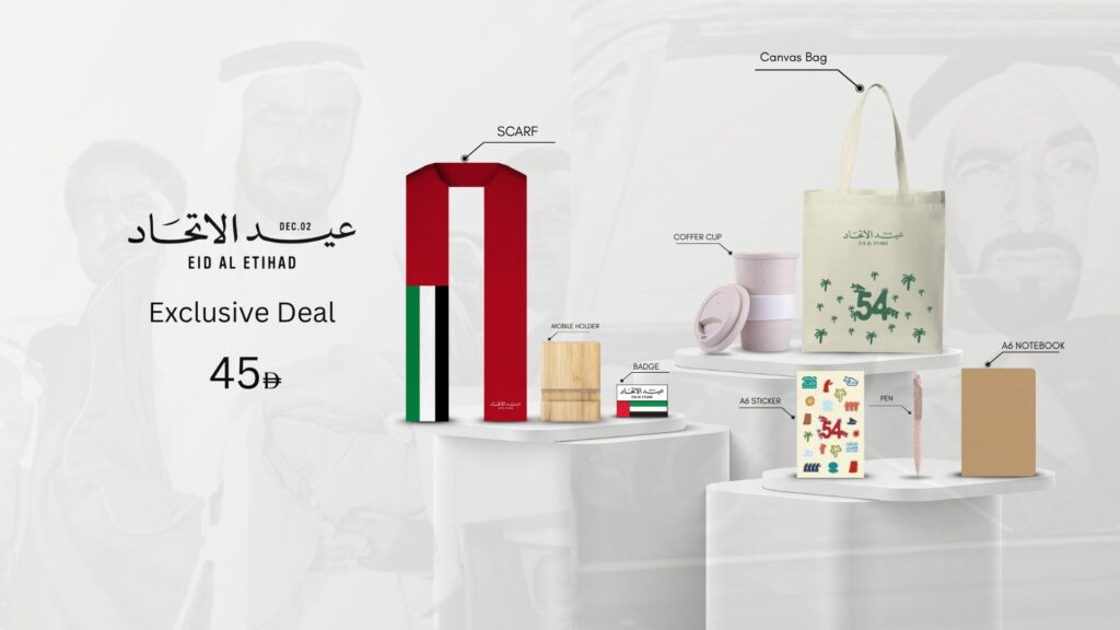 Get our exclusive National Day package for just 45 AED — featuring 8 premium items: a stylish scarf, an elegant canvas bag, a badge, a mobile stand, an A6 notebook, an A6 Sticker, a Ball Pen and a Coffer Cup.